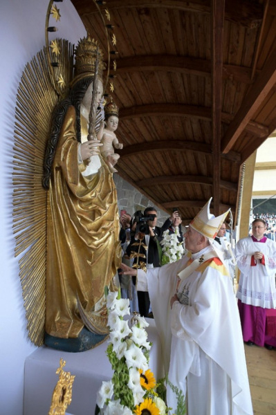 Statuia făcătoare de minuni a Fecioarei Maria de la Şumuleu Ciuc a fost scoasă din biserica fraciscană pentru prima dată după cel de-al Doilea Război Mondial şi aşezată pe altarul unde Papa Francisc a oficiat Sfânta Liturghie. La sfârşitul slujbei, Suveranul Pontif a aşezat un trandafir de aur la picioarele statuii făcătoare de minuni a Fecioarei Maria.