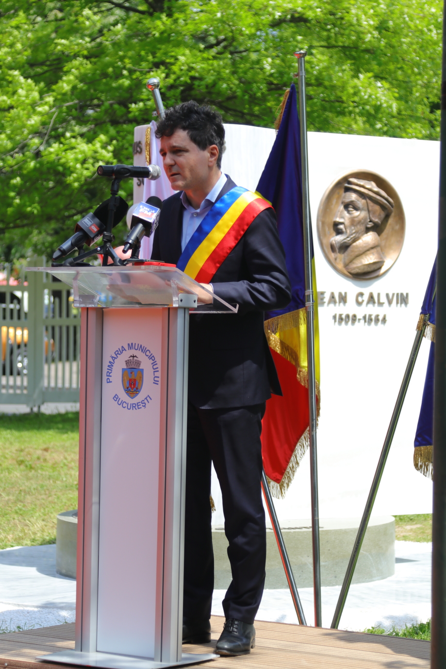 Vaida Francisc Attila a mai spus: Ridicarea acestui monument a fost propusă, în 2015, de Biserica Reformată Calvineum şi de preotul Zsold Béla, iar dorinţa a fost ca acest proiect să fie implementat în doi ani, în cadrul evenimentelor dedicate împlinirii a 500 de ani de la Reforma Protestantă. Din păcate, din cauza birocrației, a tergiversărilor de tot felul și a obstacolelor birocratice, a fost nevoie de şapte ani pentru concretizarea acestui proiect. Aşa cum se spune în maghiară: mai bine mai târziu decât niciodată. Pe parcursul implementării planului, am schimbat trei primari: Sorin Oprescu a fost primar în 2015, care a fost înlocuit de Gabriela Firea în 2016, care a fost primar general până în 2020, după care Nicușor Dan, actualul primar, a preluat conducerea Primăriei. Ei, toţi, au sprijinit proiectul, în sensul că Consiliul General al Capitalei a aprobat bugetul și organizarea concursului, care a fost câştigat de Ionel Stoicescu, cel care a realizat monumentul, el fiind un sculptor român foarte cunoscut. Ambasadorul Elveţiei la Bucureşti a şi amintit la eveniment că tot el a creat şi statuia fondatorilor Uniunii Europene, care se află în Parcul Herăstrău, pe aleea Trandafirilor. Tot creaţia lui Ionel Stoicescu este şi refacerea monumentului din Piaţa Universităţii în memoria lui Ion C. Brătianu, precum ansamblul monumental dedicat prinţului Rainier al III lea, de lângă Circul de Stat. Revenind la monumentul inaugurat acum, Ionel Stoicescu a considerat că Biblia, portretele celor doi mari reformatori, Martin Luther şi Jean Calvin, ar fi cele mai potrivite simboluri ale Reformei Protestante, scriind pe Biblie principiile Reformei: Solus Christus (Numai prin Hristos)/ Sola Fide (Numai Credinţa).