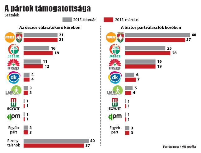 Dintre alegătorii decişi să voteze, Fidesz ar obţine 37%, scăzând sub pragul de 40% pentru prima dată de la precedentele alegeri parlamentare, desfăşurate în aprilie 2014.